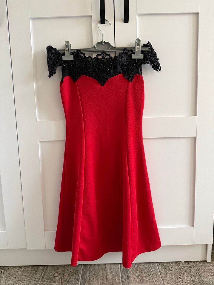 Drapeli siyah nakış detaylı, straplez kırmızı elbise. Sade kolsuz ve vücuda oturan kesimiyle gotik ve cesur bir görünüm sunar. ❤️