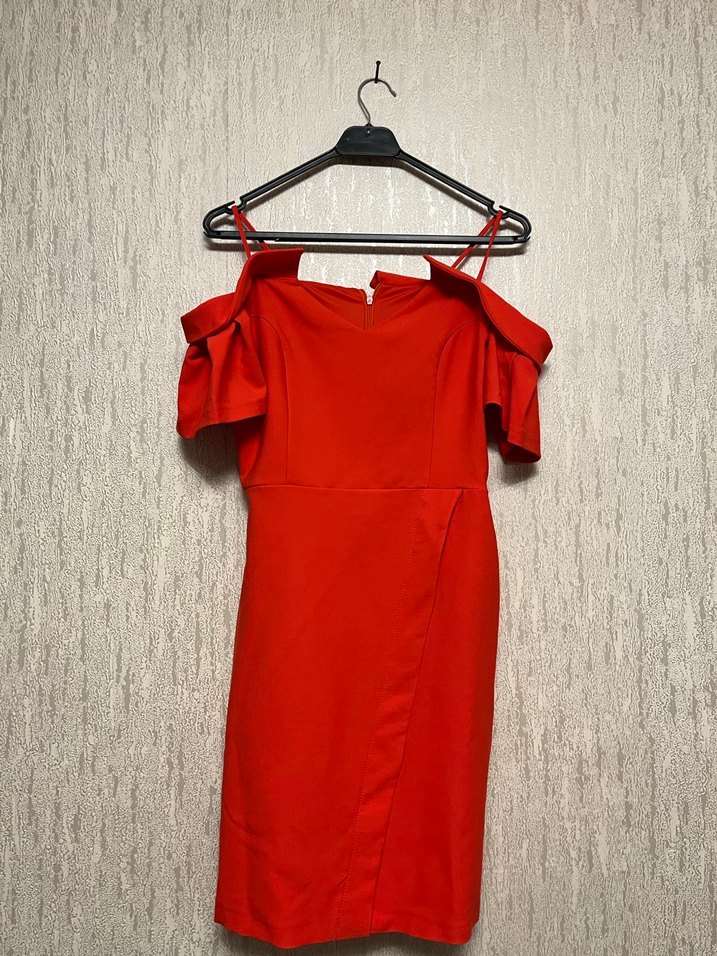 Kırmızı nar çiçeği aradı bir renkte mini elbise, drapeli omuzdan düşen kol detayları ve ince askılarla fit kesime sahiptir. Minimalist ve cesur romantik buluşmalar düğün vs için uygundur.