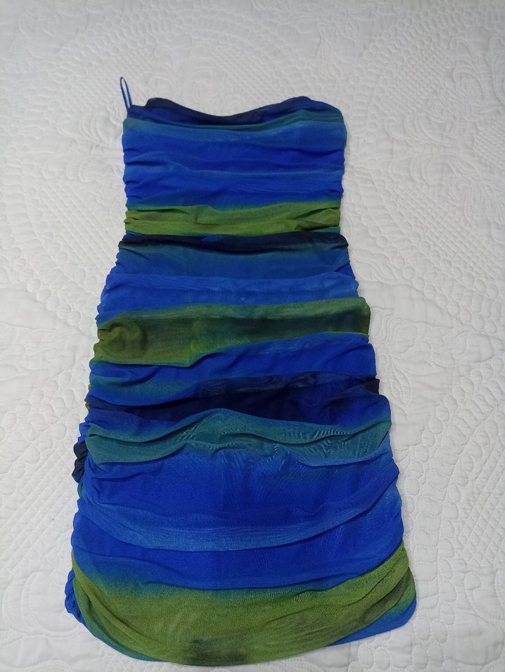 Drapeli, straplez, midi boyda, koyu mavi-yeşil tie-dye desenli, bohem tarzda parti elbisesi.