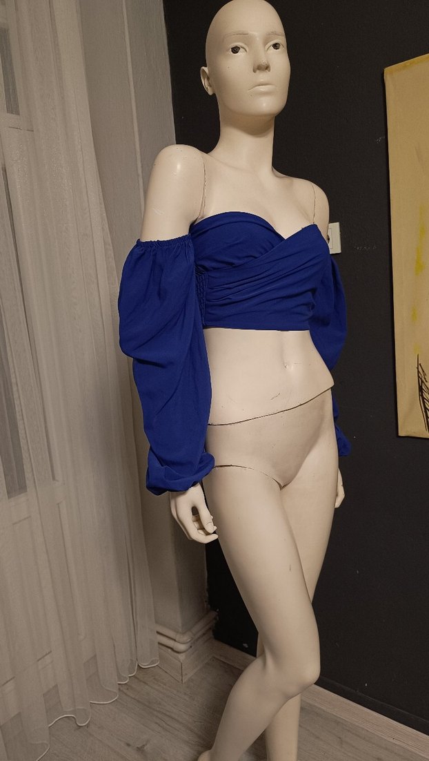 Drapeli, straplez, mavi mini bluz. Sentetik kumaştan, fitted kesim, strappy kollu, cesur sokak stili için uygun.