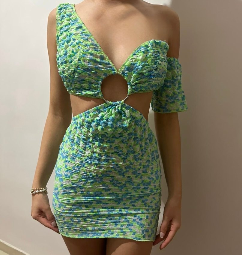 Sentetik kumaştan üretilmiş, drapeli ve straplez kısa elbise. Pastel tonlarda batik desenli, ön kısmında kesik detayı bulunan, parti için uygun şık tasarım.