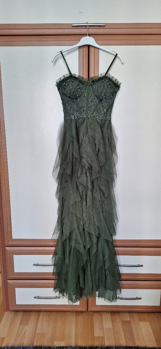 Nakışlı detaylara sahip straplez, drapeli ve uzun khaki kadın elbisesi, vücuda oturan kesimi ve kolsuz tasarımıyla düğünler için uygun. sadece 1 kere giyildi