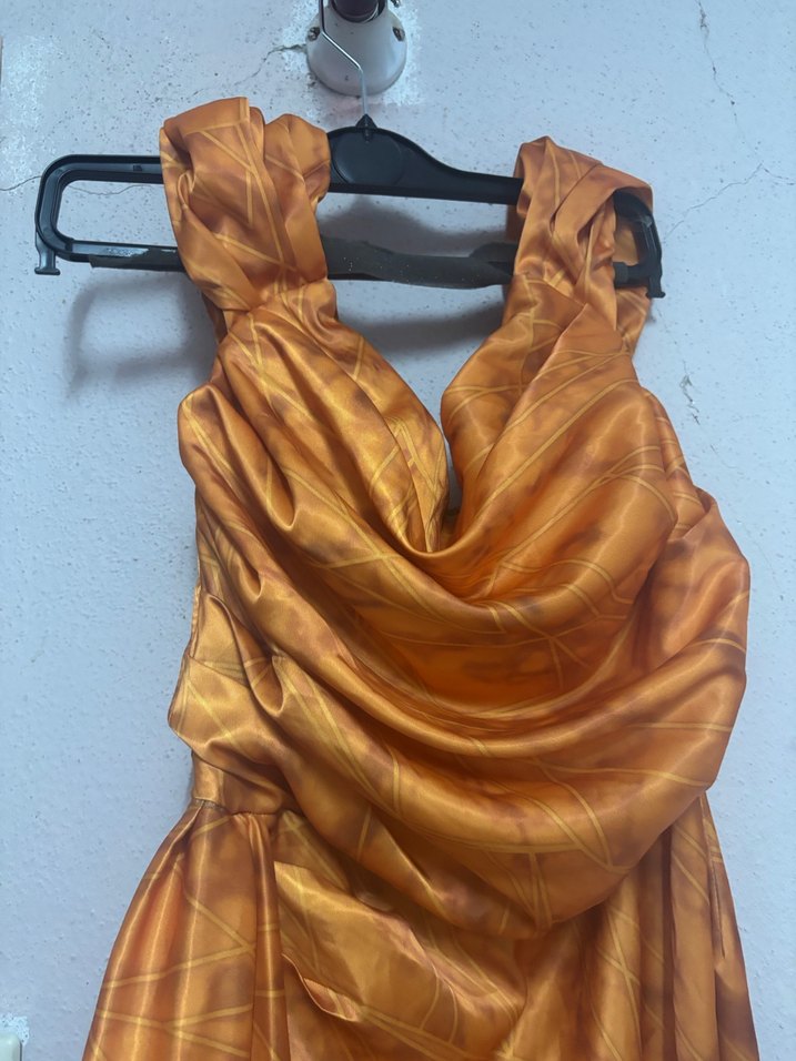 Parlak altın renkli, straplez yakalı ve drapeli detaylara sahip, uzun ve vücuda oturan abiye elbise. Düğünler için uygun. ✨