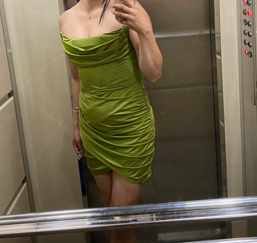 Drapeli, straplez yeşil mini elbise, parlak ve satenimsi kumaş ile dikkat çekiyor. Cesur ve şık parti görünümü için ideal. 1 kez giyildi. 40 beden içinde uygun.