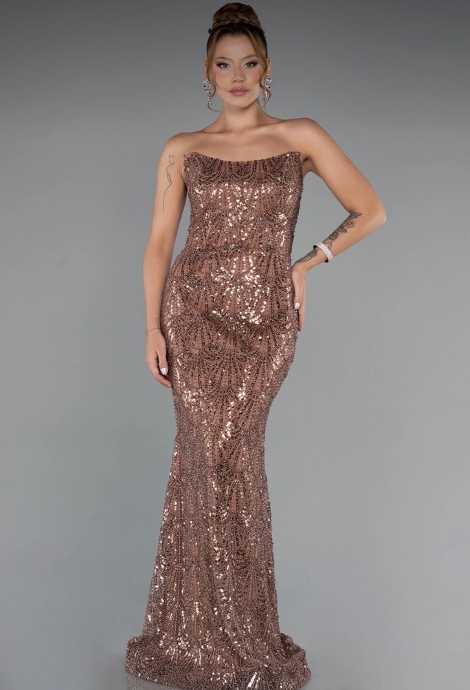 Drapeli Straplez Payetli Uzun Abiye Elbise