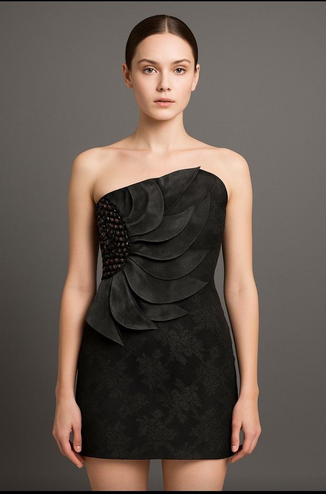 maxra govana Siyah, straplez ve drapeli tasarıma sahip, desenli kumazı ile düğünler için uygun, dar kesim kısa abiye elbise.