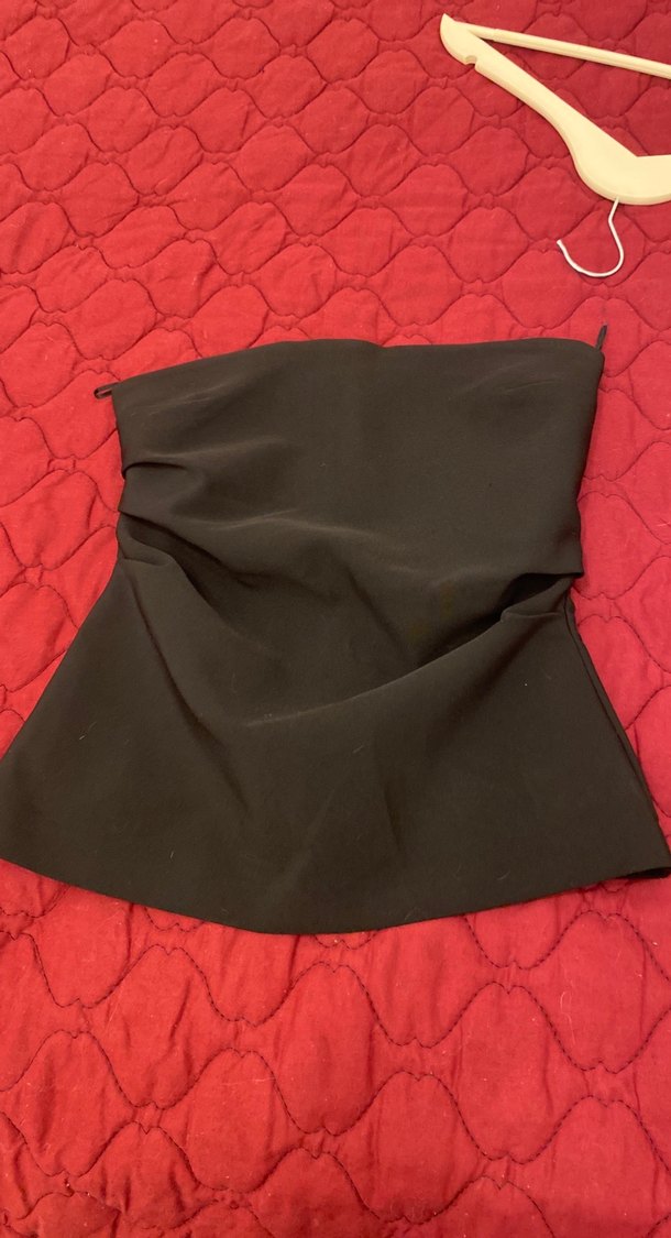 Drapeli ve straplez tasarıma sahip, fitted kesim siyah sentetik kumaştan yapılmış midi büstiyer. Avant-garde tarz için ideal, romantik akşam buluşmalarına uygun.