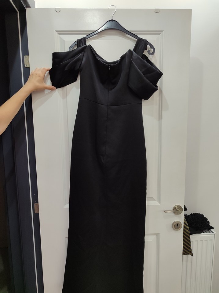 Drapeli kolları ve minimal tasarımıyla siyah, straplez, uzun ve vücuda oturan abiye elbisedir. Düğünler için uygundur, gotik tarzda.
