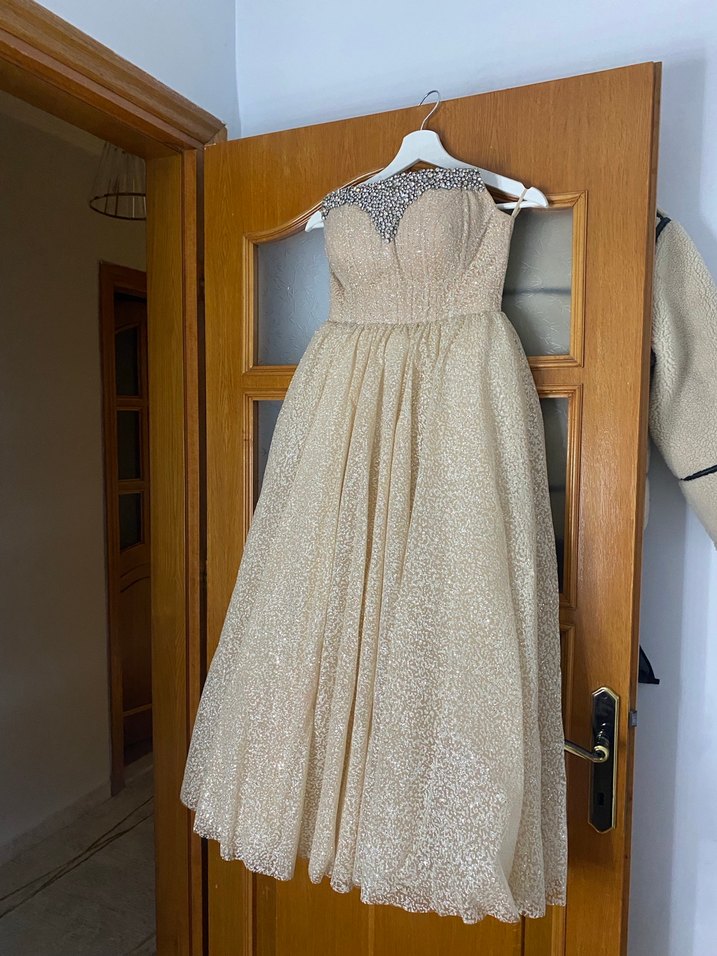 Drapeli Straplez Uzun Bej Nişan Elbisesi özel dikim