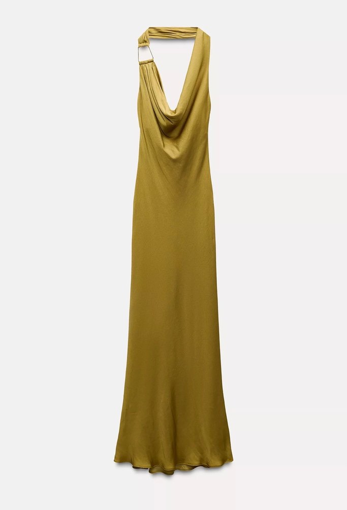 Drapeli yakası ve satenimsi kumaşıyla straplez, vücuda oturan uzun elbise. Kolsuz ve desensiz, romantik bir gece için uygun.