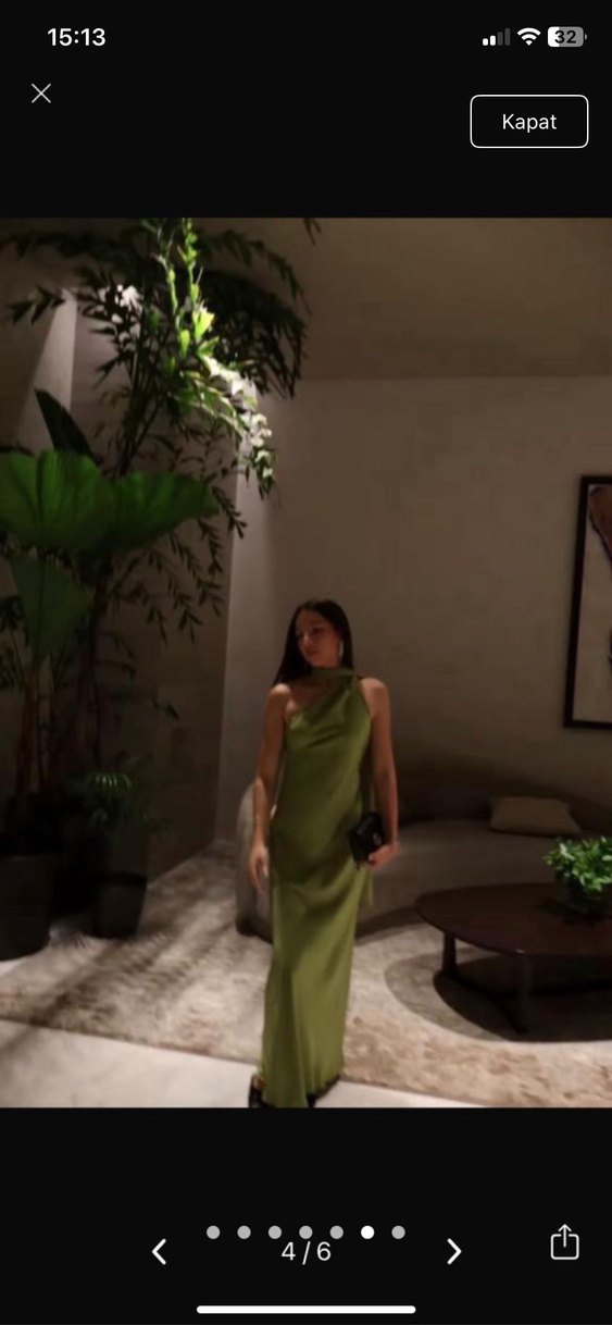 Parlak haki renkli, ipeksi kumaştan, drapeli ve straplez uzun elbise. Fitted kesimli, kolsuz ve minimal tarzda, romantik akşamlar için ideal.