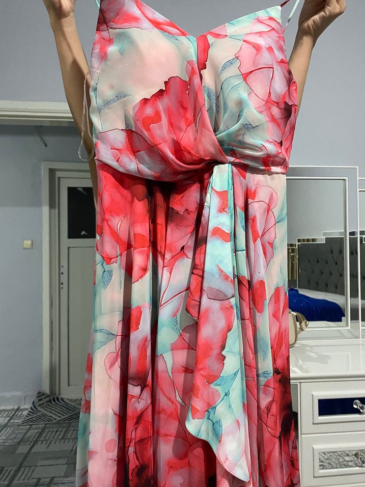 Drapeli, straplez uzun elbise, bol kesim ve pastel tonlarda batik desenlidir. Yumuşak sentetik kumaştan, çağdaş bohem tarzda, düğün için uygundur. Kolsuz, çok renkli ve canlıdır.