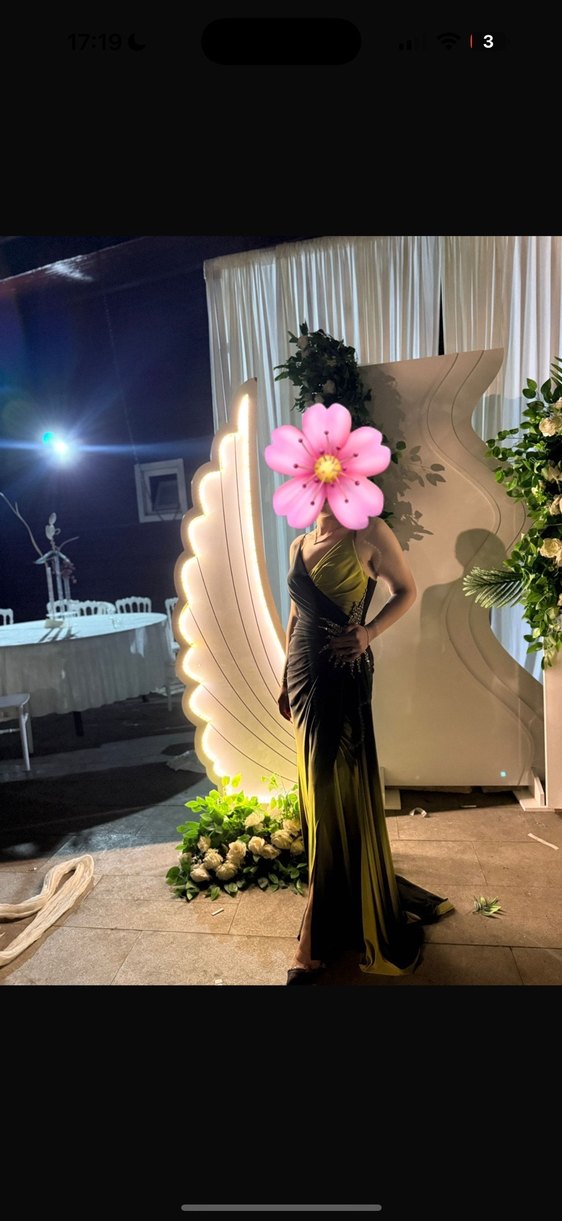 Drapeli ve straplez yakalı, koyu haki renkli çiçek desenli uzun ve vücuda oturan çağdaş tarzda gelinlik elbise.