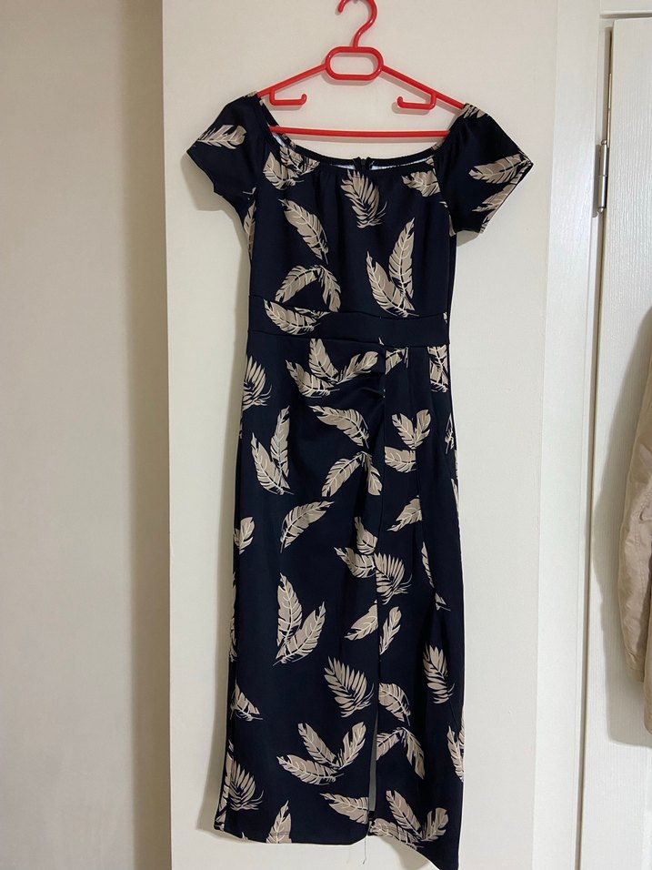 Lacivert renkli, straplez yaka ve kısa kollu, drapeli uzun ve vücuda oturan elbise. Sentetik kumaştan üretilmiş, baskılı deseniyle romantik akşamlar için uygun. M ve L bedene uygun