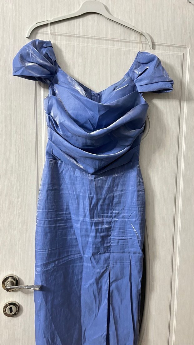 Drapeli, straplez ve uzun kesimli mavi parlak kumaştan yapılmış, düğünler için ideal modern abiye elbise.