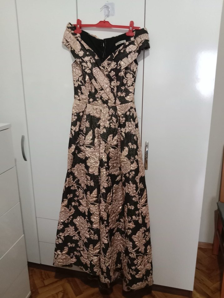 Kahverengi, straplez, drapeli ve desenli vintage tarzda uzun gece elbisesi. Rahat kesimiyle düğünler için uygundur.