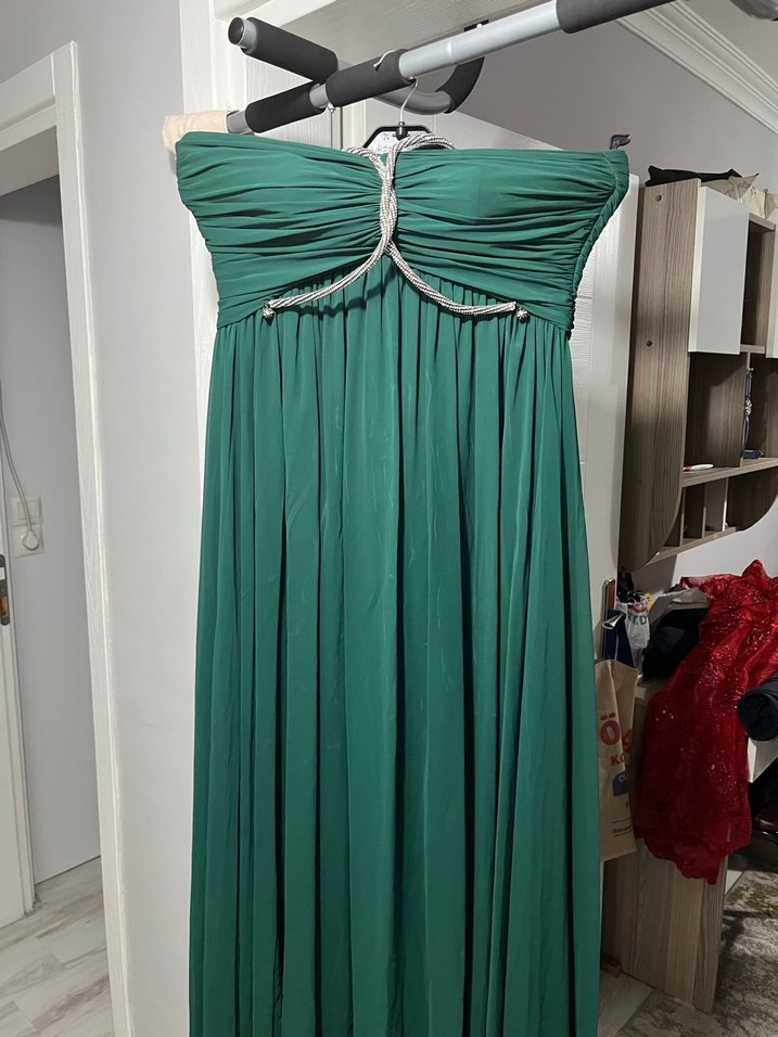 Drapeli, straplez ve uzun yeşil parlak kumaştan yapılmış abiye elbise. Klasik modern tarzda, düğün ve özel günler için uygundur. Kolsuz ve vücuda oturan kesim. Uzunluğu 135 eni 43cm