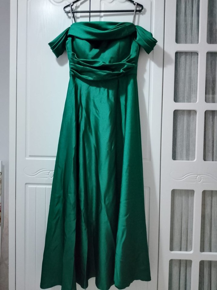 Drapeli, straplez, uzun ve yeşil parlak kumaştan yapılmış abiye elbise. Klasik zarafette, vintage esintili ve kolsuz tasarım, düğün için uygundur.