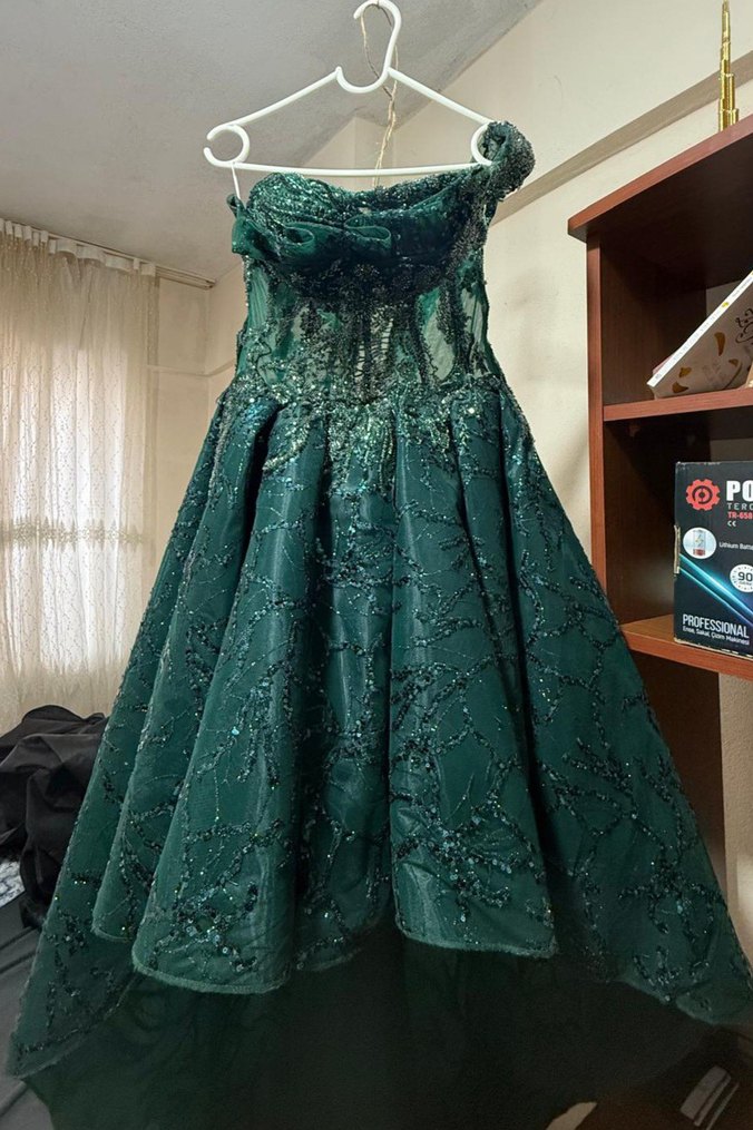 Bu dar kesim, koyu yeşil nişan elbisesi, straplez yaka ve drapeli tasarımıyla desenli, göz alıcı bir şıklık sunar. Taşlı Tacı Ve Mekikli Küpe Beden 36 / 37