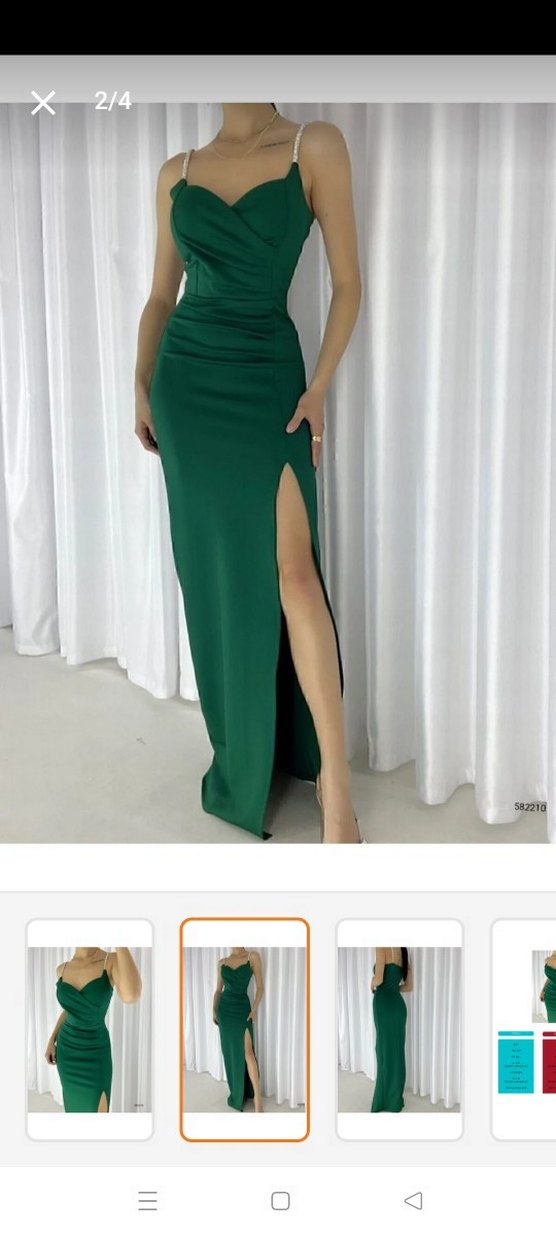 Drapeli, straplez, yeşil parlak kumaştan uzun ve vücuda oturan abiye elbise. Modern klasik tarzda, düğün gibi özel günlere uygun, kolsuz ve şık.