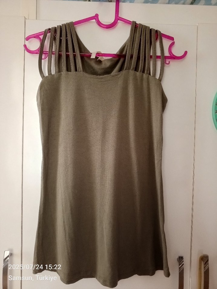 Drapeli tasarıma sahip, çoklu askılı haki renk midi kadın atlet. Yumuşak penye kumaştan, rahat ve şık sokak stili için uygun. marka temsilidir