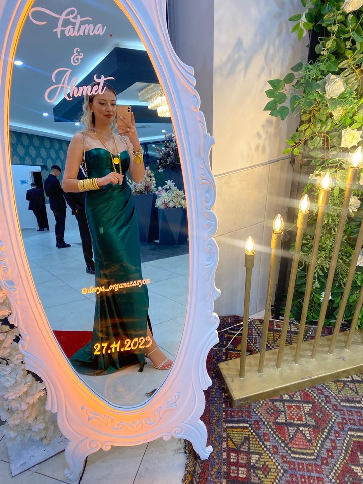 Kolları ful taştır, koltuk altına doğru taş işlemeler gelmektedir , zümrüt yeşili saten kumaş abiyedir Sadece 1 kere 2 saat giyildi başka hiç giyilmemiştir. Uzun, yırtmaçlı gece elbisesidir.
