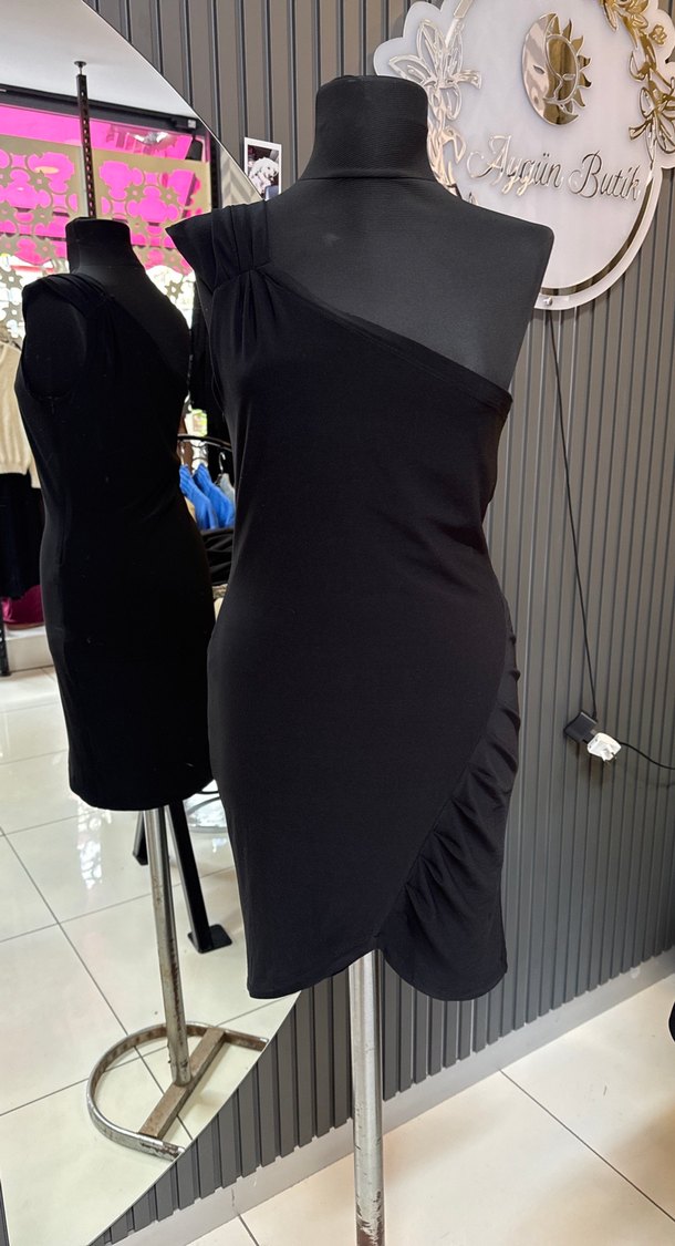 Siyah midi elbise, drapeli ve tek omuz tasarımlı, vücuda oturan kesim ve kolsuz yapısıyla avant-garde parti stilleri için uygundur.