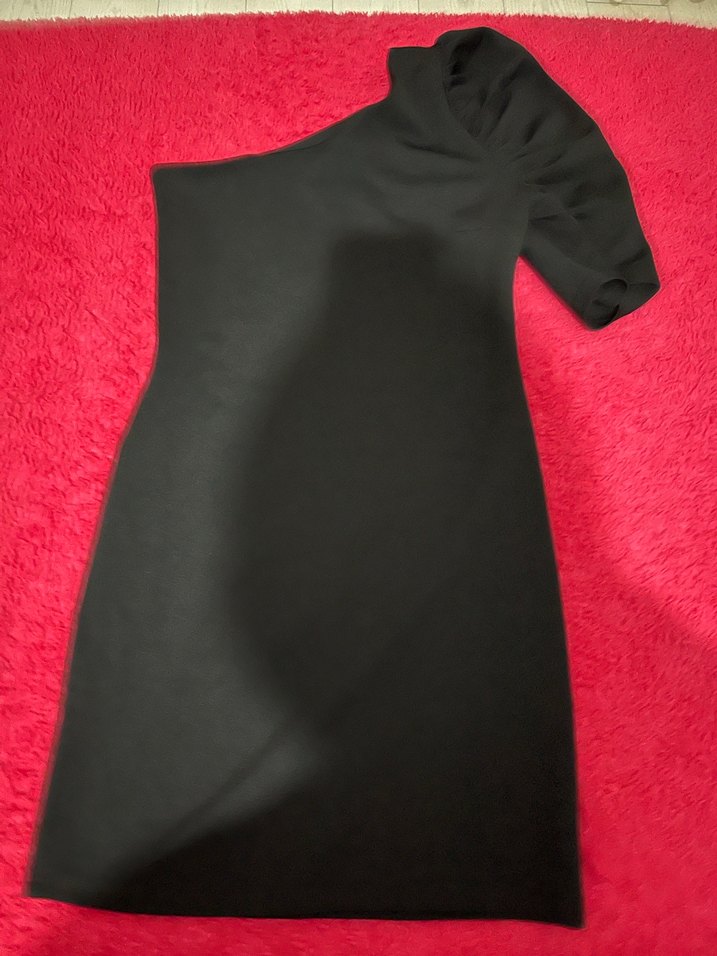 Drapeli, tek omuzlu kısa kollu, straplez yakalı siyah midi elbise. Hiçbir kusuru yoktur bir kere giyilmiştir.36-38 arasına olur