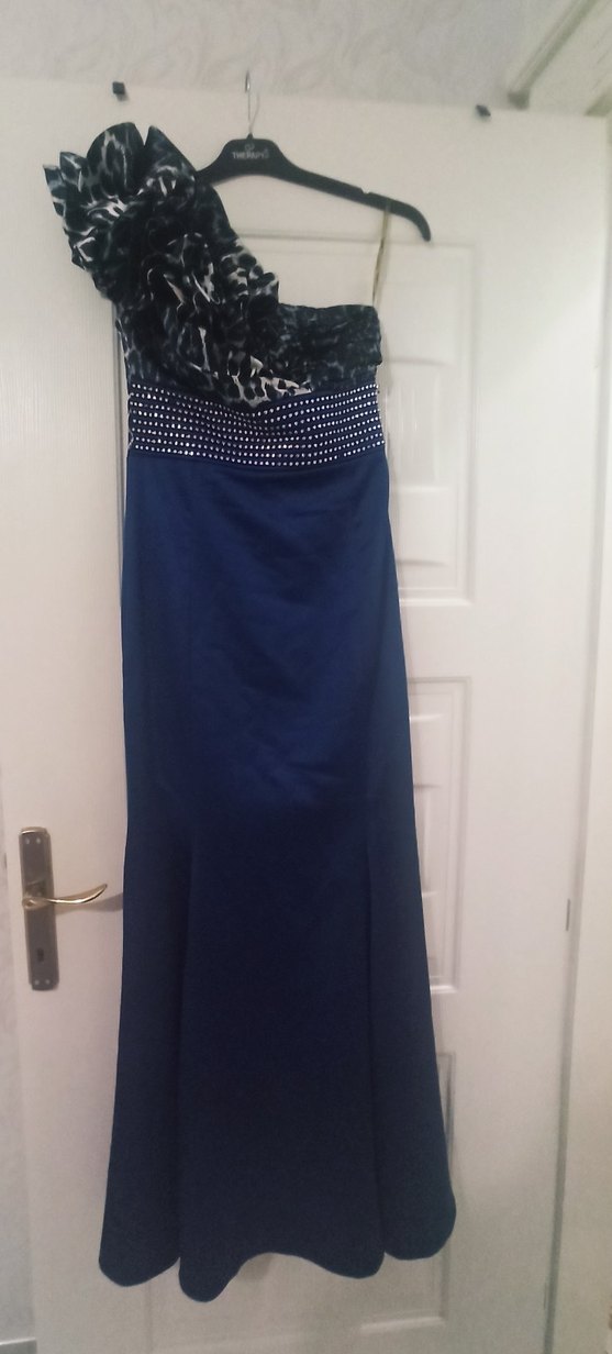Tek omuzlu, drapeli ve desenli üst kısmı olan uzun, dar kesim lacivert abiye, şık düğünler için uygundur.