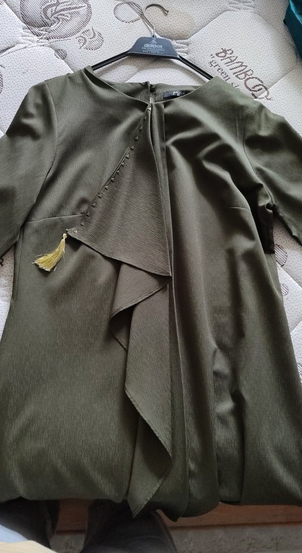 Haki renkte, drapeli ve uzun kesim Yumuşak sentetik kumaştan, uzun kollu, günlük kullanım için uygundur.