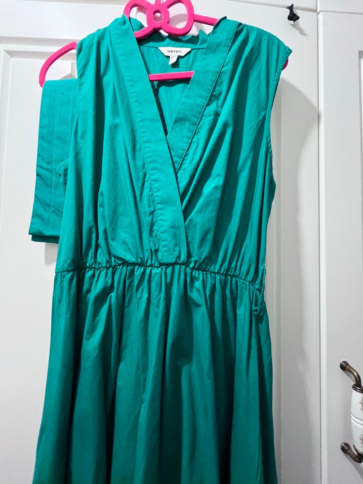 Drapeli, V yakalı ve kolsuz uzun elbise koyu turkuaz renkte yumuşak sentetik kumaştan yapılmıştır. L bedendir. Kemeri mevcut görsel yanındadır.