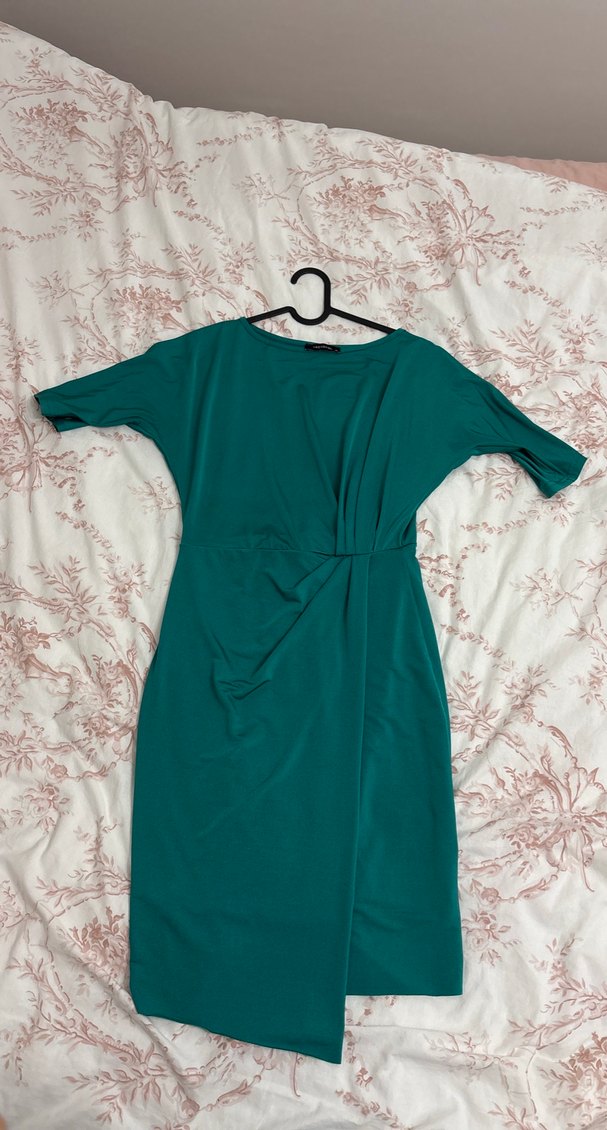 Bu dar kesim elbisesi, tek renk koyu turkuaz renkte, tekne yaka ve kısa kolludur. Drapeli detaylarıyla bohem tarzı yansıtır, ofis için uygundur. Şık 34:36 uyum sağlar