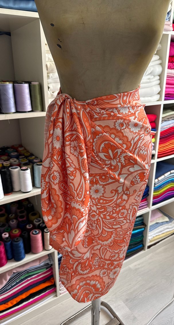 Hafif turuncu renkte, çiçek desenli, drapeli bohem kadın pareo. Yumuşak sentetik kumaştan üretilmiştir. Retro ve hippie tarzına uygundur.
