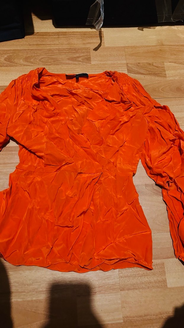 Turuncu parlak renkte, keten kumaştan yapılmış, drapeli ve V yakalı, uzun kollu, vücuda oturan kadın bluz. Outdoor kullanıma uygundur. Omuzları büzgülü Kolları dekolteli abiye şık bluz