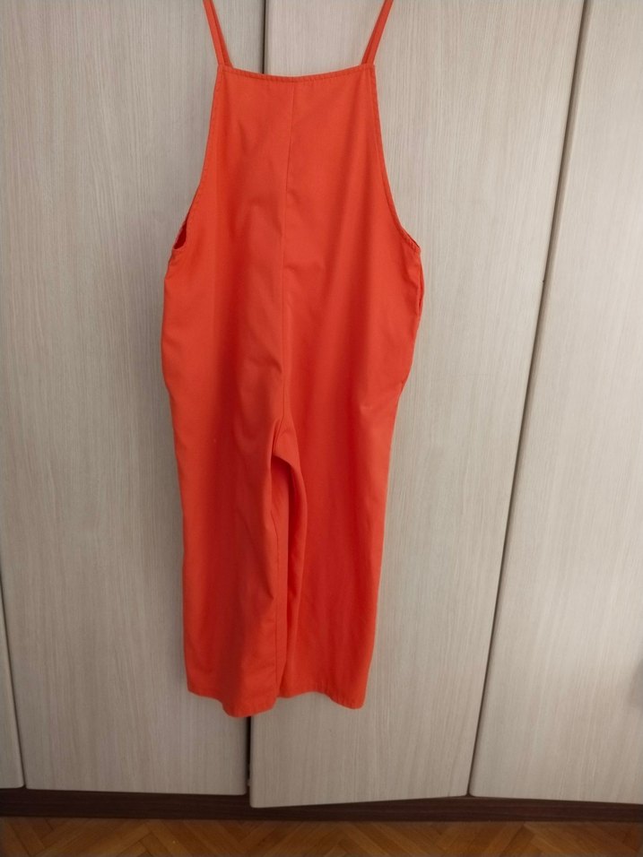 Parlak turuncu saten kumaştan, yüksek yakalı ve drapeli, kolsuz, dar kesim tulum. Sokak modası için uygun, günlük kullanıma ideal. çok minik lekesi var M ve L uyumlu olur