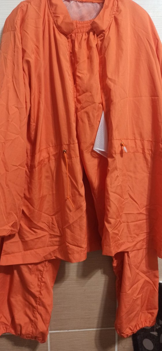 Kadın yağmurluğu, drapeli tasarım, kesik rever yakalı, bol kesim ve kolsuzdur. Parlak turuncu sentetik kumaştan yapılmıştır, günlük kullanıma uygundur. ️