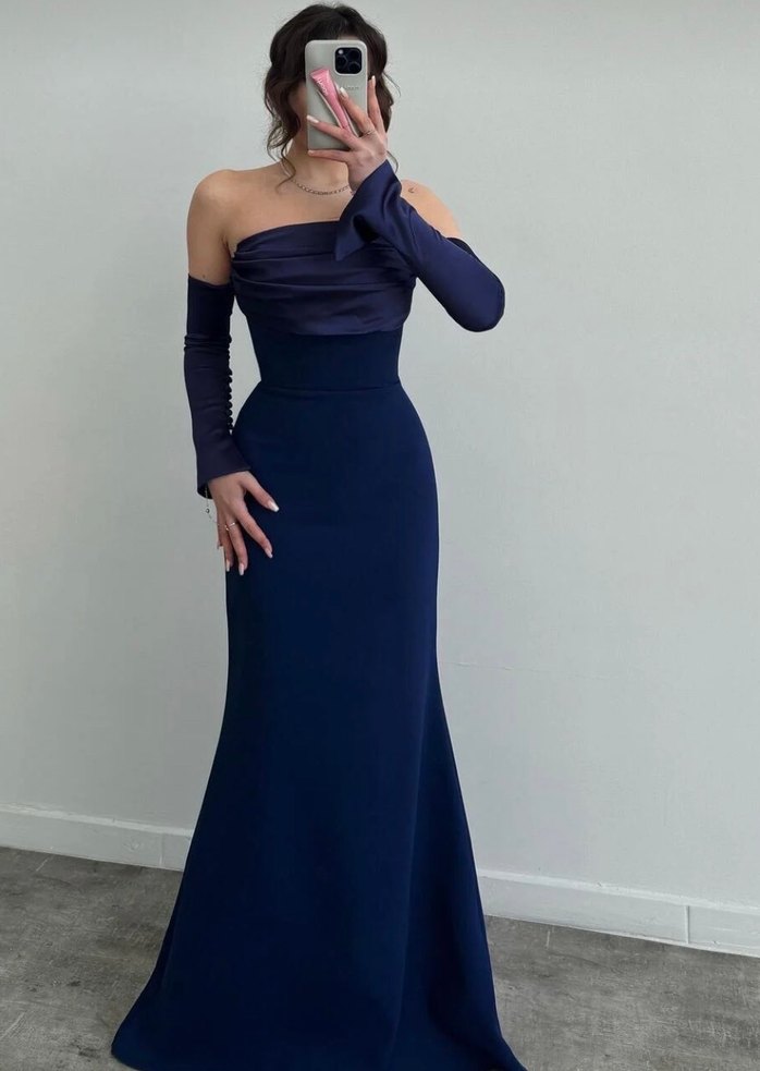 Lacivert renkte, drapeli detaylara ve uzun kollara sahip, klasik ve modern kesim uzun abiye elbise. ✨