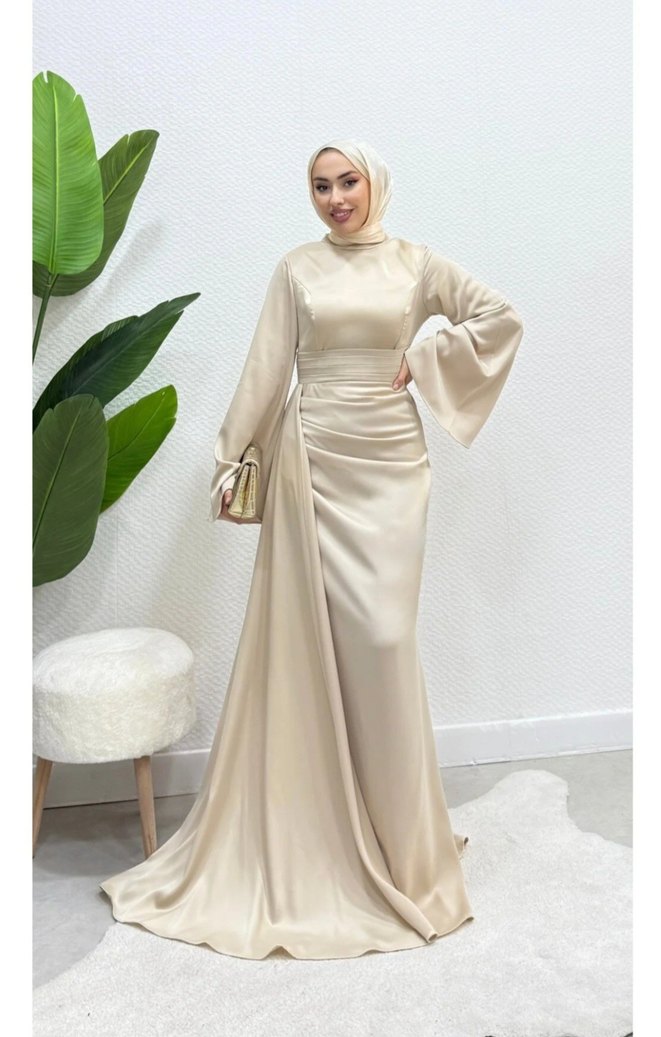 Bej renkte, drapeli detaylı, uzun kollu ve tek düze uzun abiye elbise. Minimalist, çağdaş tarzda, düğün için uygun, parlak kumaşa sahip. etiketi üstünde hic giyilmedi sıfır son görselde üretim hatası cok ufak belli olmayan bir çizik var detaylı bilgi için yazınız