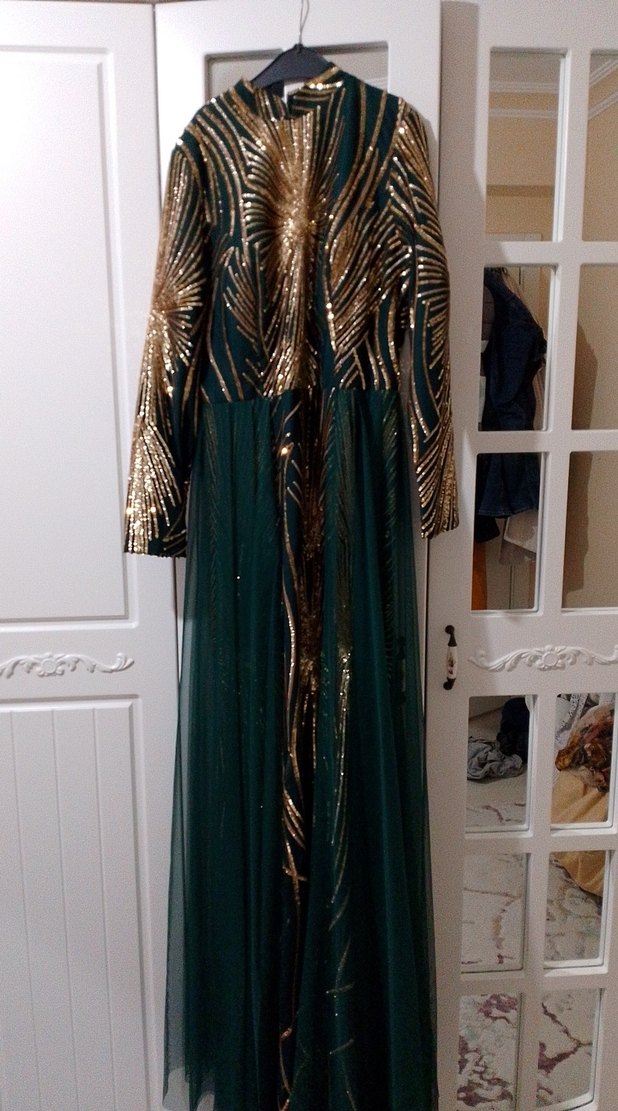 Bu uzun, bol kesim abiye koyu renk zemin üzerine altın desenlerle süslenmiştir. Uzun kollu ve yakası kesikli, drapeli bohem tarzda, parti için uygundur. ✨