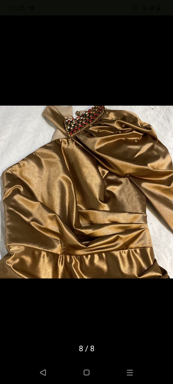 Drapeli Uzun Altın Renkli Kadın Abiye Elbise
