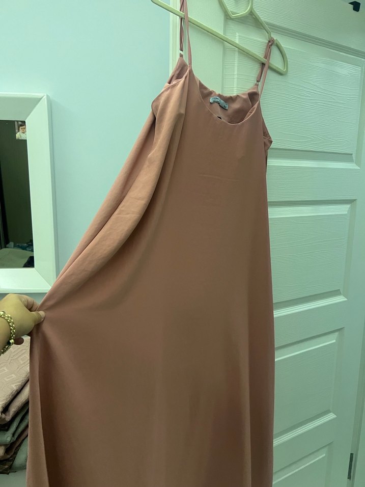Askısız, drapeli ve bol kesim uzun elbise, pastel renkte yumuşak ve ipeksi kumaştan. Günlük kullanım için uygun, minimalist ve normcore tarzda.