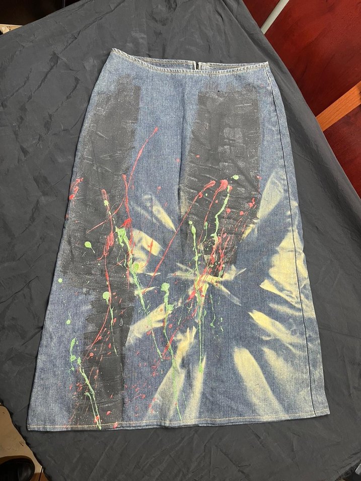 Drapeli tasarımı ve çok renkli bağlama deseniyle uzun, bol kesim kot etek, dış mekan kullanımı için uygundur.