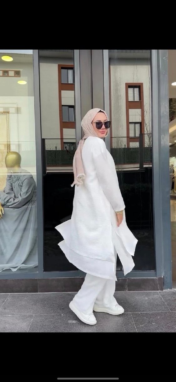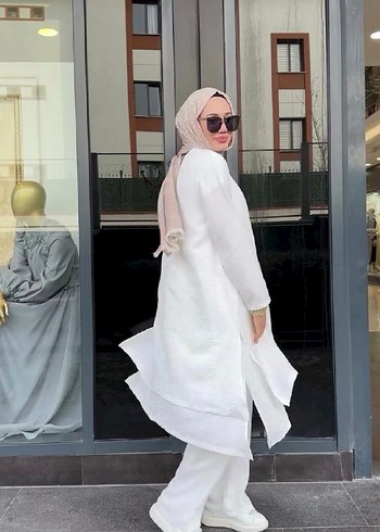 Sentetik kumaştan üretilmiş, drapeli tasarımlı, uzun beyaz kadın takımı. Yüksek yakalı, uzun kollu ve bol kesimdir. Günlük sokak stiline uygundur.