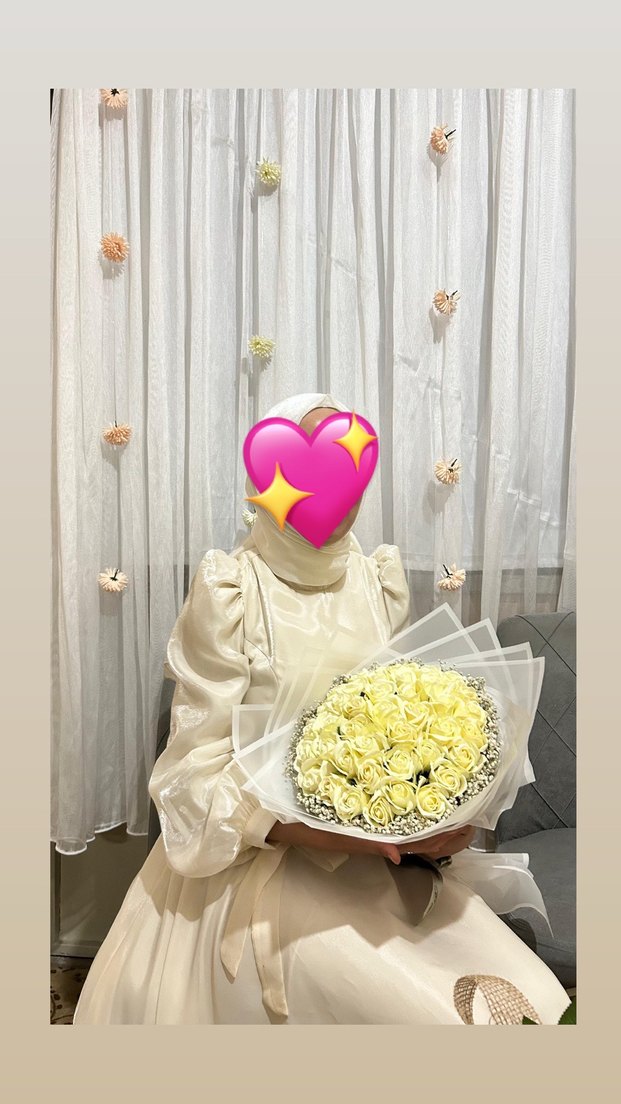 Drapeli detaylara sahip, çiçek desenli, yüksek yakalı ve uzun beyaz nişan elbisesi. Modest ve avant-garde tarzı bir arada sunar. Şal dahildir.
