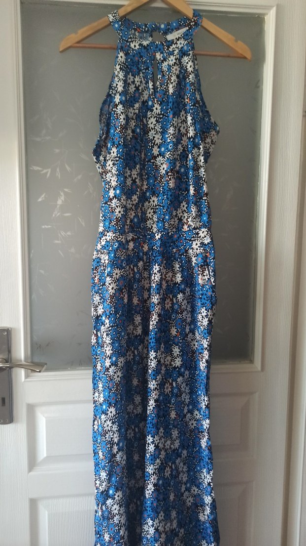 Bohem tarzda, drapeli ve yüksek yakalı, elbise.Mavi tie-dye desenli, rahat kalıp ve yumuşak sentetik kumaştan yapılmıştır. ceplidir birkez giyildi.