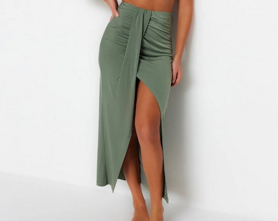 Drapeli ve yüksek yırtmaçlı, uzun haki renkli kadın eteği. İnce ve vücuda oturan kesim. Sadece 1 kere kullanıldı.