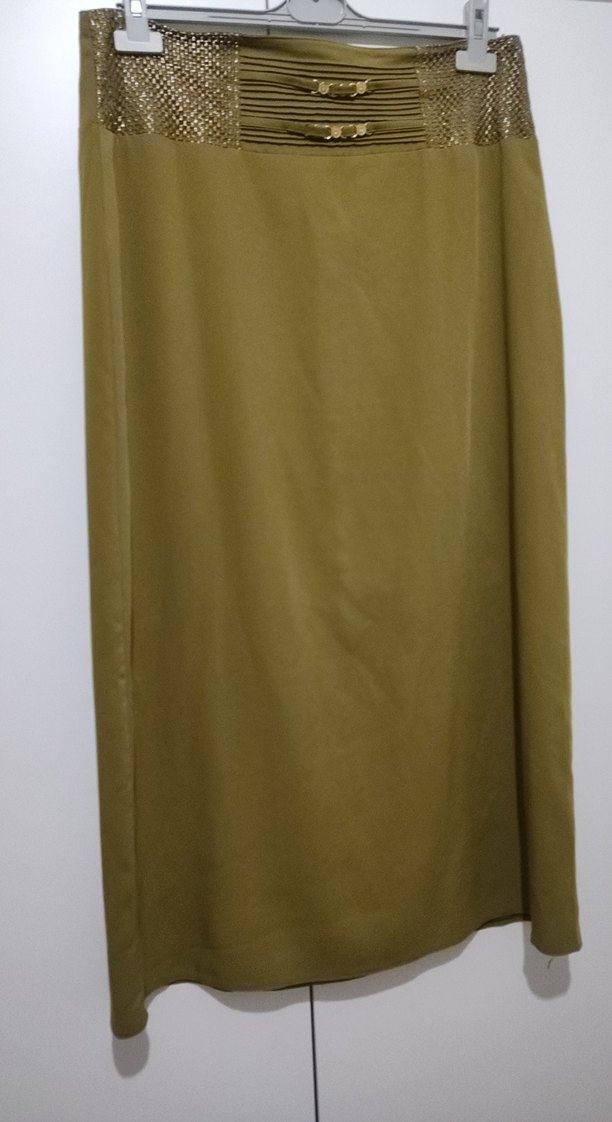 Kına yeşili etek... Parlak sentetik kumaştan, drapeli tasarıma sahip uzun haki kadın eteği. Ofis kullanımı için sade ve minimalist tarzda, regular fit.
