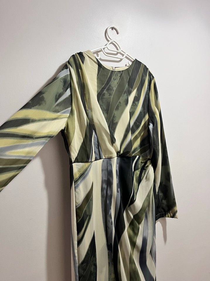 Bu uzun elbise, gri ve haki tonlarda batik desenli, drapelidir