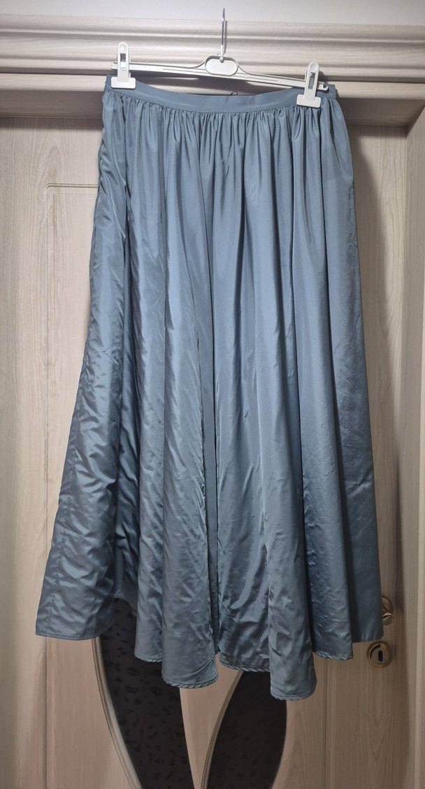 Kadınlar için drapeli uzun etek, bol kesim ve ipeksi kumaştan yapılmıştır. Mavi-gri renkte, minimal tarzıyla düğün ve şık etkinliklere uygundur.