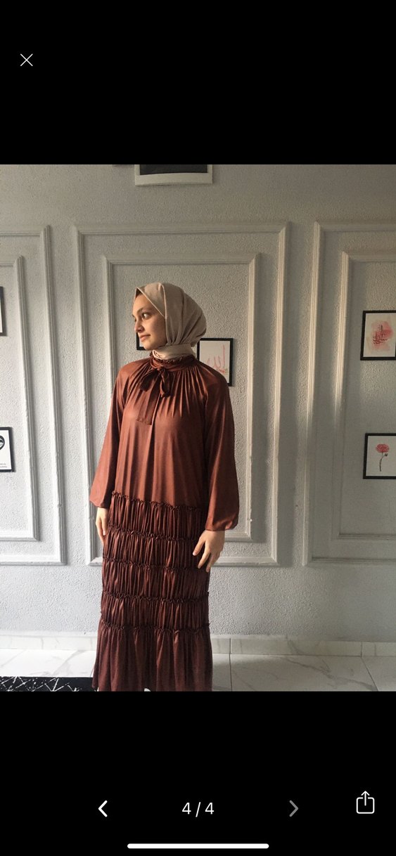 Uzun, kahverengi, drapeli ve bol kesim elbise. Yüksek yakalı, saten dokulu, strappy kollu, günlük kullanıma uygun bohem tarzda.standart beden